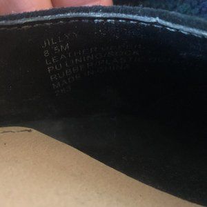 Suede upper with rubber sole. Heel measures approx 5.5" H. Platform measures approx 1.5" H. Buckle closure