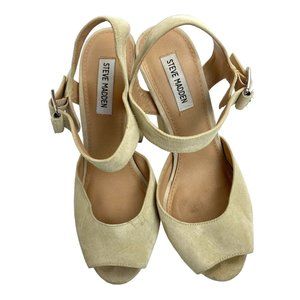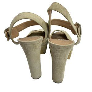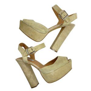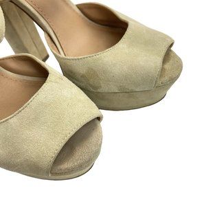 Jillyy Platform Peep Toe Chunky Sandals Size 9MSuede leather upperColor is a tan/beige shadeAdjustable buckle ankle strapHeel is about 5.5" high and platform is 2" high