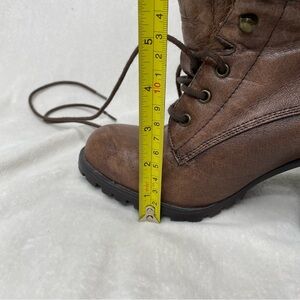 Steve Madden Judii brown leather ankle boot. Leather upper has rustic look with synthetic sole. Shaft measures 4" from arch. Inner sock lining for layered look. Lace up front with double hook and eye at opening. See photos for heel and front sole measurements.