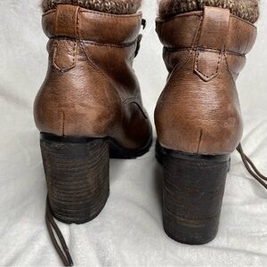 Steve Madden Judii brown leather ankle boot. Leather upper has rustic look with synthetic sole. Shaft measures 4" from arch. Inner sock lining for layered look. Lace up front with double hook and eye at opening. See photos for heel and front sole measurements.
