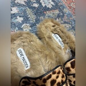Step into cozy style with these Steve Madden Kaden-L slide-on mules, featuring a bold leopard print and luxe real calf hair upper.