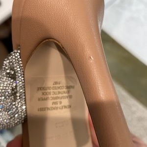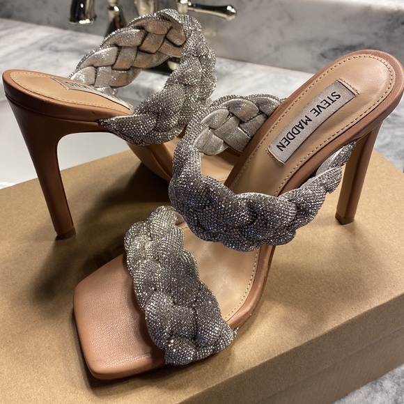 Small nicks on left heel shown in photo. Elevate your go-to open-toe pump with KENLEY-R heels. Thick braided straps with rhinestone embellishments complement a tall slender heel, for an ultra-luxe appeal.