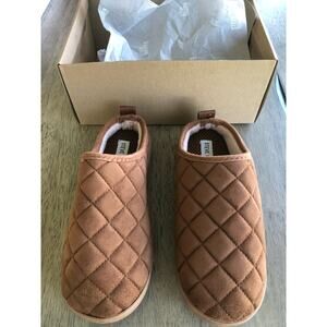 These slippers are comfy and cozy. They feature a quilted texture in the color Cognac. These slip-on mules have a cushy footbed with a sherpa lining. They have a 1in heel/footbed. It has a textile upper and a polyester faux sherpa lining with a synthetic heel. New in box.