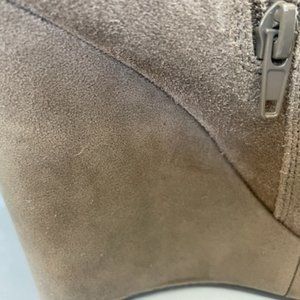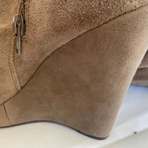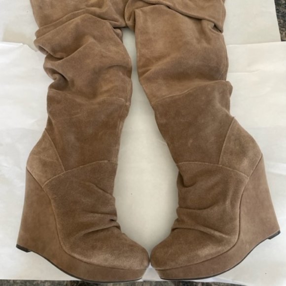 Size 7.5, Steve Madden Knee High Suede Taupe Wedge Boots. Excellent condition - worn maybe 4 times. zip up the inside ankle with scrunch look. Very sexy and comfortable. Heels and soles look brand new.