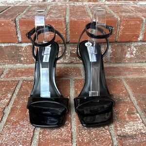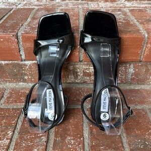 Step into sophistication with these stunning Steve Madden patent leather heels. Featuring sleek black patent leather straps that elegantly wrap around your foot, these heels are designed to make a statement. The clear, transparent block heel adds a unique and stylish touch, perfect for both casual and formal occasions.