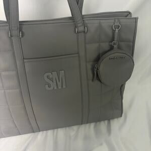 • Large quilted gray polyurethane exterior with silver-tone “SM” logo