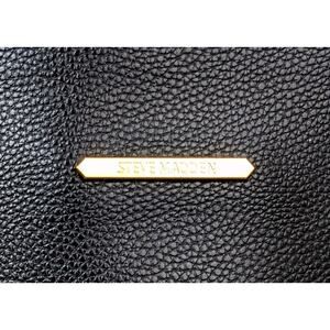 The exterior features a classic black pebbled texture complemented by a subtle gold-tone Steve Madden logo plaque and 2 large slip pockets. The interior reveals a charming black and white floral pattern with a zip pocket and a slip pocket for organization. This bag is designed for both functionality and fashion, offering ample space for your essentials. It is in perfect, unused condition.
