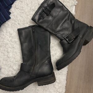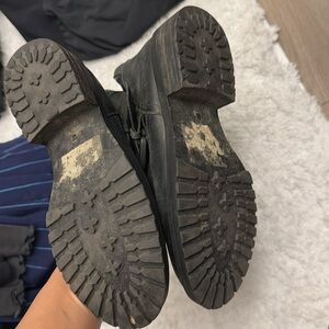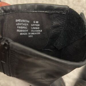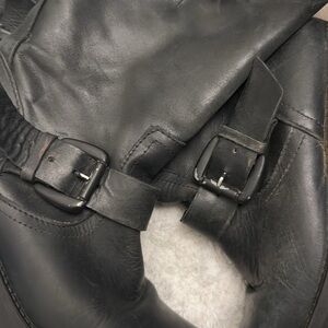 Genuine leather. Can use a good cleaning but are in otherwise good condition. Black coating on buckles has started to come off but they still look good. All zippers and buckles function.