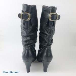 Ruching at shaft, fold-down collar with accent adjustable buckle at back, moderate heel, round toe, leather upper, Smooth fabric lining, lightly cushioned insole, flexible midsole, slightly textured outsole for traction, Pull-on style, Wrapped heel.