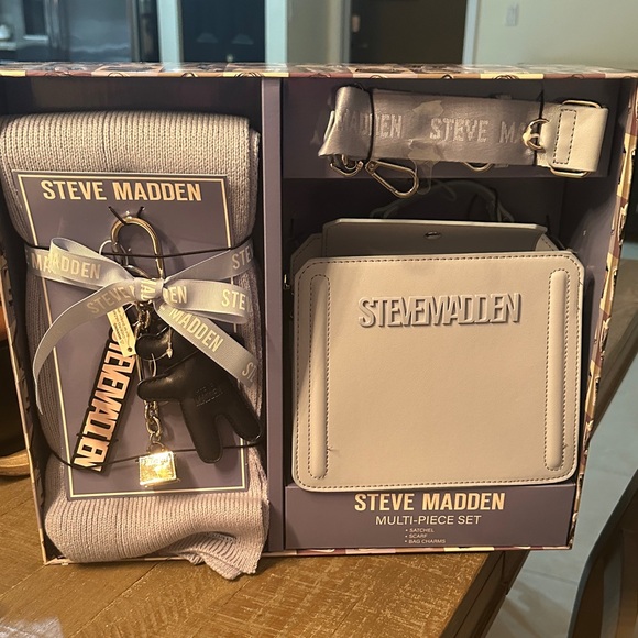 Elegant Steve Madden set featuring a chic bag, cozy scarf, and stylish keychain. Ideal for versatile use.