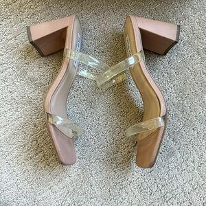 Translucent straps create a barely-there silhouette in the fresh block-heel lift of Steve Madden's Lilah dress sandals.