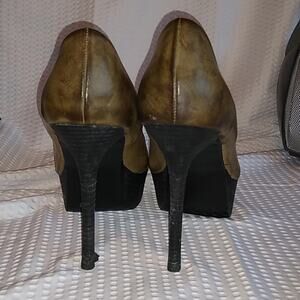 These sky-high five-inch heels are still relatively comfortable because of the 1.5" platform on the front of the shoe. Finish on the shoe is a factory distressed medium brown faux leather color.