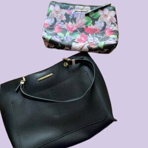 This elegant black tote w/ matching floral clutch/removable pouch is perfect for any occasion. Its sleek design and spacious interior make it a must-have accessory. In excellent like new condition no callouts. Interior has no staining or tears. Faux leather.
