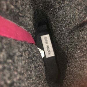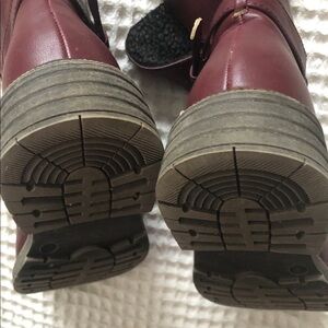 Pretty Steve Madden Maximus Vegan Leather Boot. Burgundy Size 9M. Double buckle around ankle. Sherpa lining in charcoal. Round Toe. Side Zipper. 1.5” heel. Shaft is approx 6.5”. Some light scratches/sole great condition. Gently Loved.