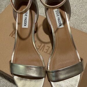Steve Madden Irenee Gold Metal heeled sandals - size 8 - worn for one night - great shape, few minor imperfections on the heel (seen in pics)
