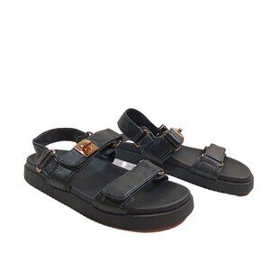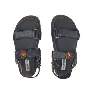 Color: Black Brand: Steve Madden Size: US 5.5M Leather upper Synthetic Lining/Sole Open toe Gold tone hardware Adjustable strap closure Molded footbed 1 inch heel Style: Mona, dad sandals Condition: Very good Stylish gold tone hardware adds some bling to this strappy Steve Madden sandal set on a molded footbed for all-day comfort. Pre-owned sandals in very good condition, light wear.