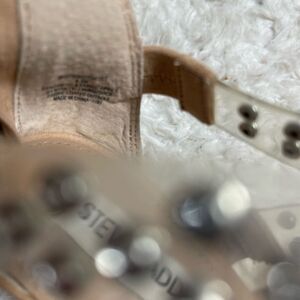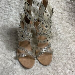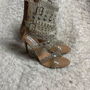 Steve Madden Moto Multi Straps Stud clear ankle strap sandals nude faux suede back zipper SZ8.5M .Pre owned in good used condition signs of wear on the outer soles see all pictures any questions please message.