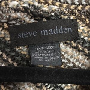Chic knit poncho by Steve Madden. Features a blend of black, brown, and cream colors. Ideal for stylish layering.
