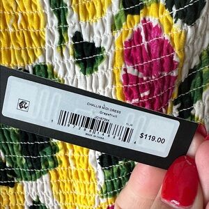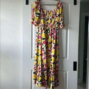 Vibrant smocked maxi dress with grapefruit and lemon design. Features pink, yellow, and green accents. Comfortable and stylish.