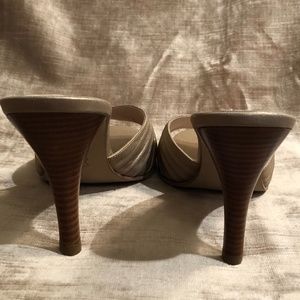 Features man made faux wood stacked spike heel and gold leather pleated crisscross leather upper.