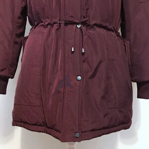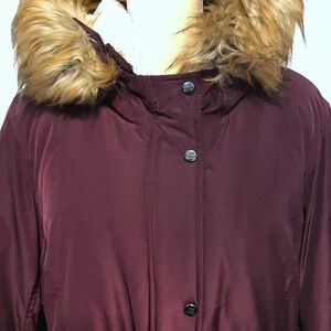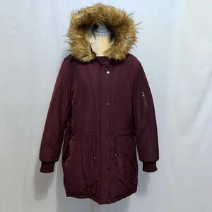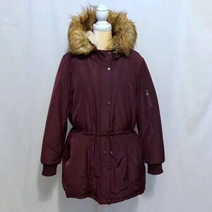 NWOT. Burgundy puffer jacket for Women Plus Size 1X. Zipper and snap button for closure, Adjustable strap at waist and bottom hem, Sherpa lined hood with removable faux fur, non removable hood, 2 side pockets with snap buttons for closure, 1 pocket with zipper left sleeve, ribbed cuffs. Black bandeau and necklace are not included. Pictures are part of description.