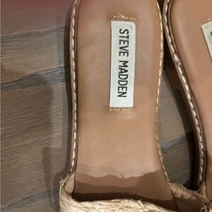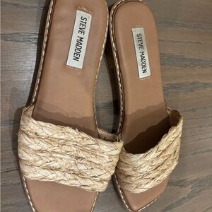 Chic Steve Madden slides with woven design. Ideal for casual wear. Comfortable and stylish.