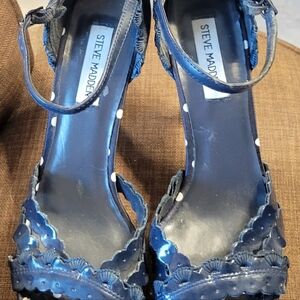 Step out in style with these chic Steve Madden sandals. Featuring a striking blue color with playful polka dots, these shoes are perfect for any occasion. Elevate your wardrobe with this fashionable and comfortable choice. These are such a cute retro 50s vibe! They're navy blue patent, have some scalloping around the toe box in the front, with a polka dot lining that you can see when you move your toes. These fasten at the ankle, and they're more of a stiletto wooden heel. They are just precious! The bottom looks like I may have worn them one or two times, so they are in excellent condition, other than being dusty!!!