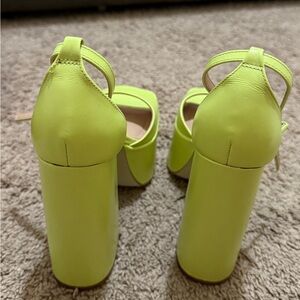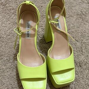 Bold neon green heels with platform and ankle strap. Chunky design by Steve Madden.