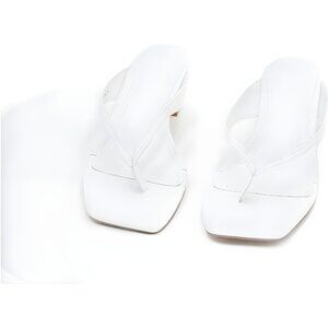 Crisp white heeled sandals elevate any outfit with a modern square toe and minimalist thong strap for chic appeal.