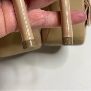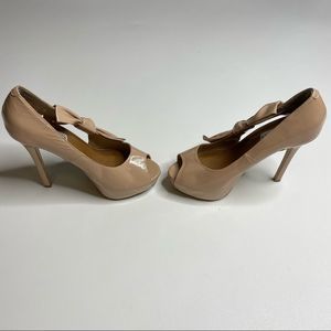 Steve Madden Patent Tan Side Bow Peep Toe Heels /Nude/Tan Bowderek Nude Open Toe Side Bow Stiletto Shoes Sz 7.5. Look at all the pictures. These are in good used condition. Minimal signs of wear.