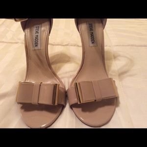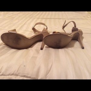 Patent leather nude stiletto heel with gold metal "bow" detail. Heel height 4.5 inches worn once.