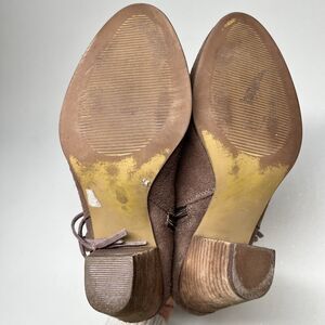 In great pre-owned condition, gently worn. Minimal signs of wear and tear. No known rips or tears. Please note any light signs of wear including slight wear to the soles and suede and one small dark spot on right shoe by zipper--see photos. Carefully look at all photos for condition, sizing and design details.