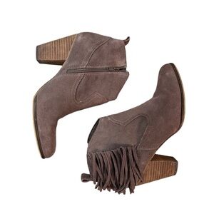 Steve Madden Ohio Suede Fringe Cowgirl Booties interior zipper, 3.5” wood heel, women’s size 8.5