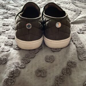 Chic olive slip-on shoes with quilted design. Easy to wear and stylish.