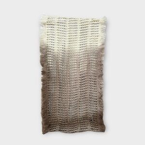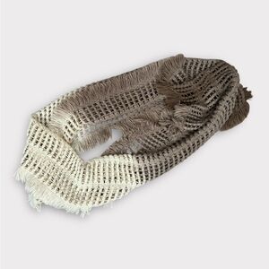 Soft acrylic, waffle knit infinity scarf featuring a gradient of cream and beige colors and fringed edges.