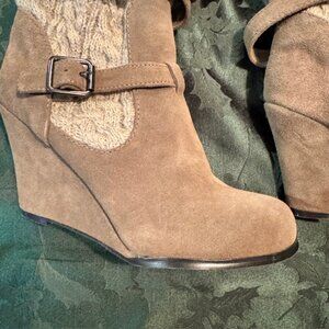 Tan/ Beige Suede & Knit Ankle Wedge Boots with buckle straps - Fun & Stylish!