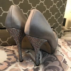 Worn 2x. 8.5 Steve Madden PLATFORM Pumps. Steel satin color with rhinestone stiletto heels! GORGEOUS!!!!!!