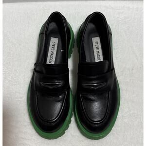 Steve Madden Penny Loafers Size 6 Black Leather Green Chunky Platform Lug Soles