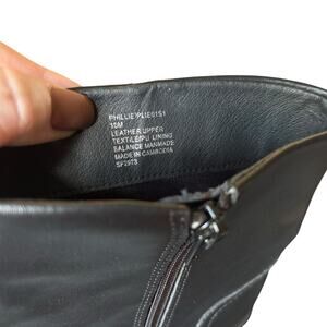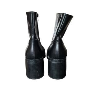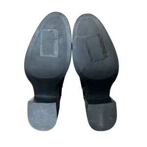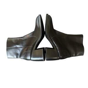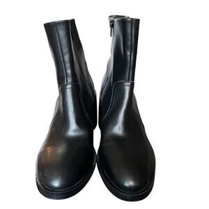 Beautiful black leather upper with wrapped block heel and almond-shaped toe, resting on a sturdy 2″ heel. Convenient side zipper and 5.5″ shaft height. Crafted with a leather upper, synthetic lining, and rubber sole. These are brand new, never worn—just without the original box.