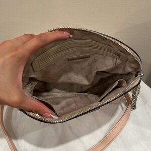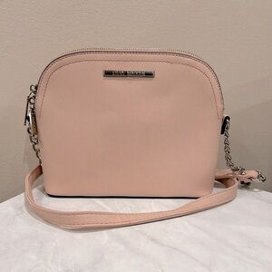 This Steve Madden crossbody bag in a soft pink hue features a sleek dome shape and elegant silver hardware. Its minimalist design and removable strap make it a versatile accessory for both casual and formal occasions. Used once. Excellent condition