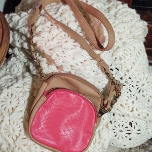 Small pink/tan Vegan leather Some damage on the strap. Used good condition! Pretty clean inside.