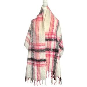Steve Madden Pink White Plaid Fuzzy Plush Fringed Chunky Long Oversized Scarf
