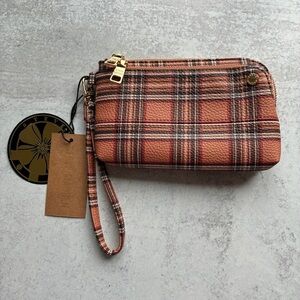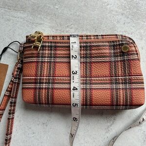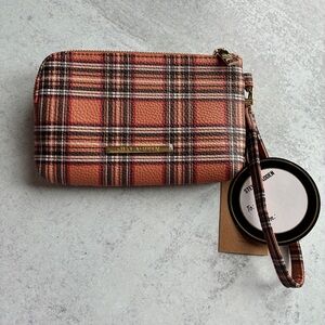 Stylish plaid wristlet clutch perfect for any occasion. Features a classic red and brown design. Ideal for keeping essentials close at hand.