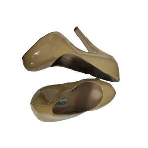 Wedding Church Work Special Event Sexy Vintage--Elevate your style with these stunning Steve Madden platform heels. With a chic stiletto heel style, these shoes are perfect for any occasion. The patent leather and leather upper material in a gorgeous gold color adds a touch of glamour to any outfit. These heels are sized at 7.5 and feature a comfortable platform design. They have been well-maintained and show no signs of stains or tears. Don't miss out on a chance to add these fabulous shoes to your collection.