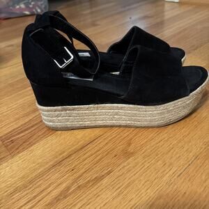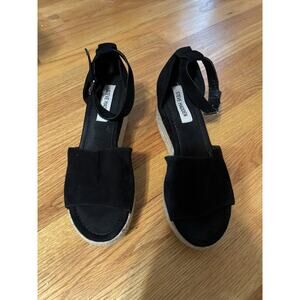 The Steve Madden Platform Sandal with Ankle Straps in size 8.5M is a stylish and trendy women's shoe perfect for casual occasions. The black color, high wedge heel, and open toe design give it a fashionable look. Made with suede material, this sandal offers both comfort and durability. With its strappy style and ankle strap feature, this shoe is a versatile option for the summer, fall, and spring seasons. Ideal for those looking for a chic and trendy footwear option.