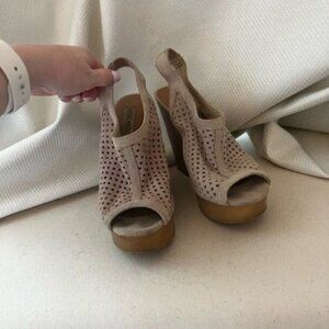 Wooden wedge and fabric on top. Breathable and open toed. Tan shade. Size 6
