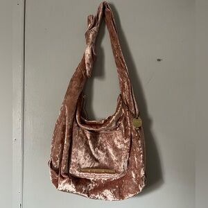 Elegant plush hobo bag with a soft pink hue. Features a roomy interior and chic style.like new