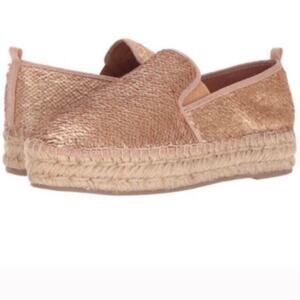 Steve Madden Poppi Sequin Platform Espadrilles featuring easy slip-on style with rear pull tab, PU and fabric upper, fabric lining and jute sole. Platform Height: 1.25”. Heel Height: 1.5”. Size: 6.5. Color: Champagne. GU. No shoe box.