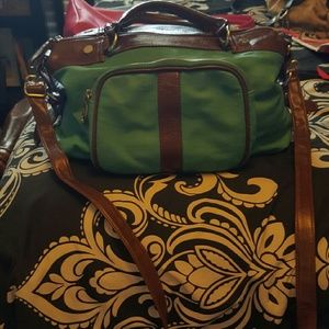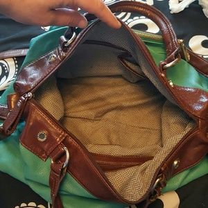 Teal SM purse. Has a long strap, could be used as a crossbody or shoulder bag. Has a few flaws from wear. Big with a front zipper pocket.