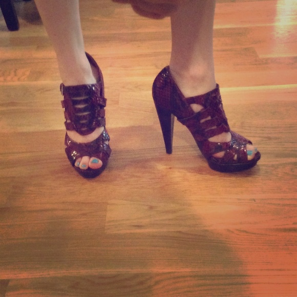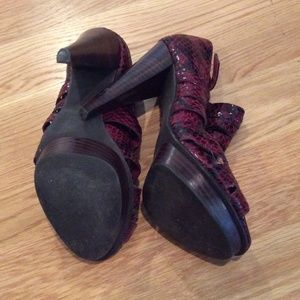 Red and Black snakeskin heels. Lightly worn. Straps have fraying from storage but can easily be cleaned up. Heel is a dark brown wood.